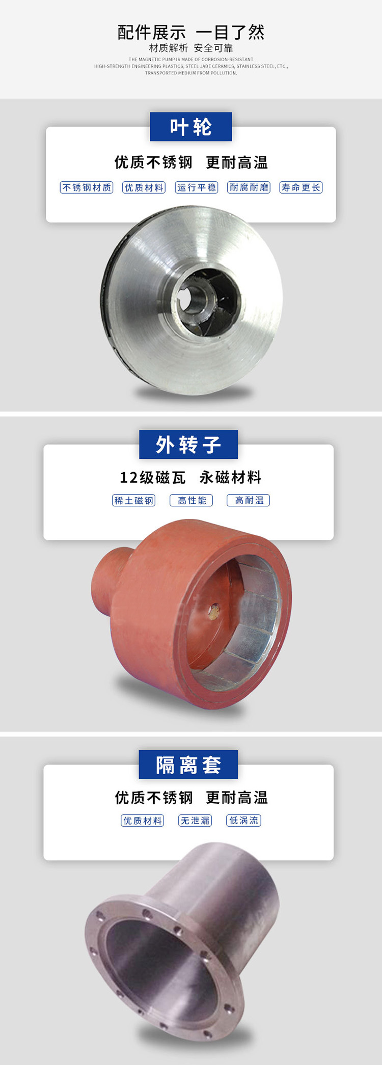 博生牌塑料磁力泵以靜密封取代動(dòng)密封,使泵的過(guò)流部件處于完全密封狀態(tài),徹底解決了其他泵機(jī)械密封無(wú)法避免的跑、冒、滴之弊病。磁力泵選用耐腐蝕、高強(qiáng)度的工程塑料、鋼玉陶瓷、工程塑料等作為制造材料,因此它具有良好的抗腐蝕性能,并可以使被輸送介質(zhì)免受污染。